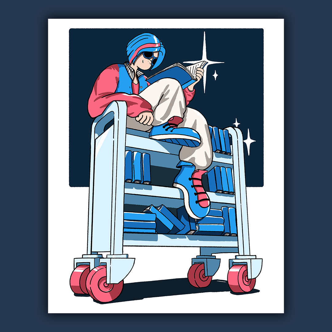 This illustrated art piece celebrates the fact that reading is cool. It features a relaxed girl sitting on a book cart reading a book. She has sunglasses and baggy, comfy clothes.