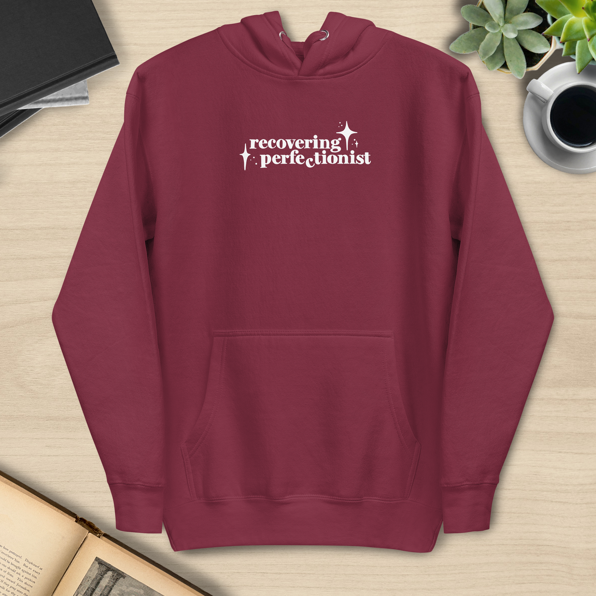 Progress over perfection. This hoodie is for all of us who just can't seem to get out of our own perfectionist way. It features the phrase "recovering perfectionist" in a clean style. It's a slightly slim fit, so I recommend sizing up for a more relaxed feel. Perfect for anyone learning to let go of unrealistic expectations.
